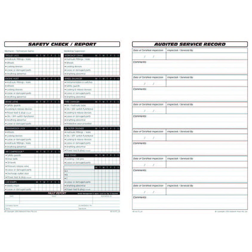 This logbook is designed for performing daily pre start safety and maintenance checks on automotive tools and equipment. This logbook ensures ease of recording and compliance with legally required WHS checks.